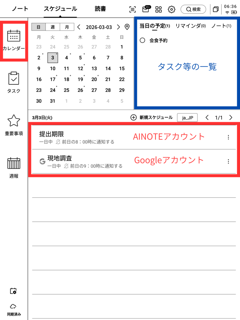 上段の予定「提出期限」はAINOTEアカウントに同期、下段の「G」マークはgoogleアカウントのスケジュールです。