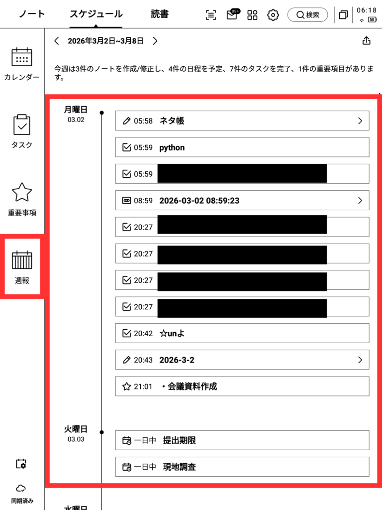 『週報』では週ごとに、予定や重要事項、タスクを完了した日を一覧で確認で来ます。