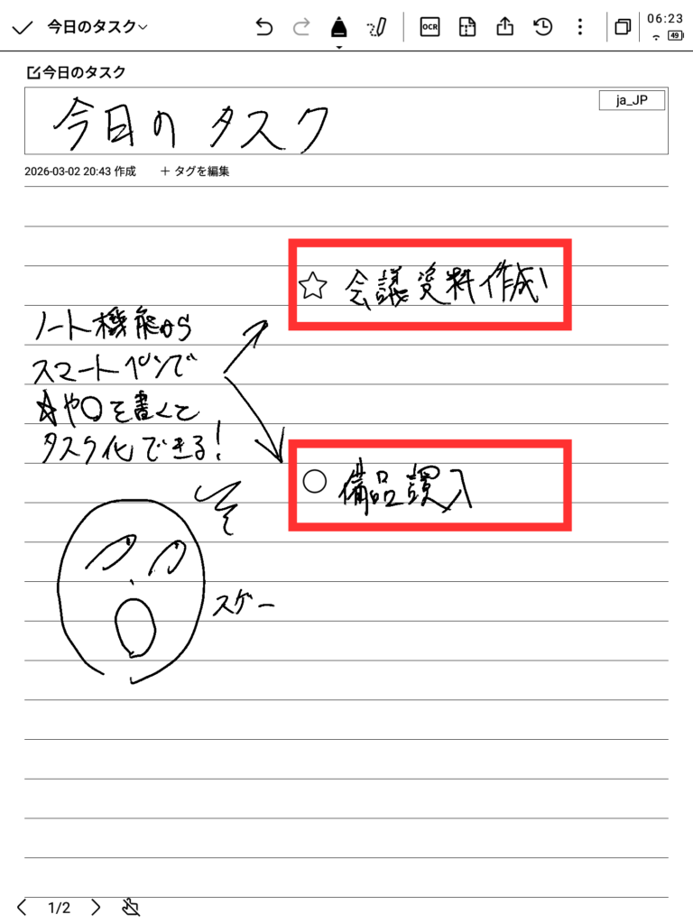 『ノート』にスマートペンで「○」を書くと「タスク記載エリア」となり、横に書いた文字がタスク化します。スケジュール機能からこのノートにジャンプできません