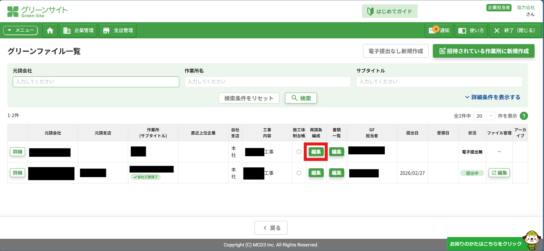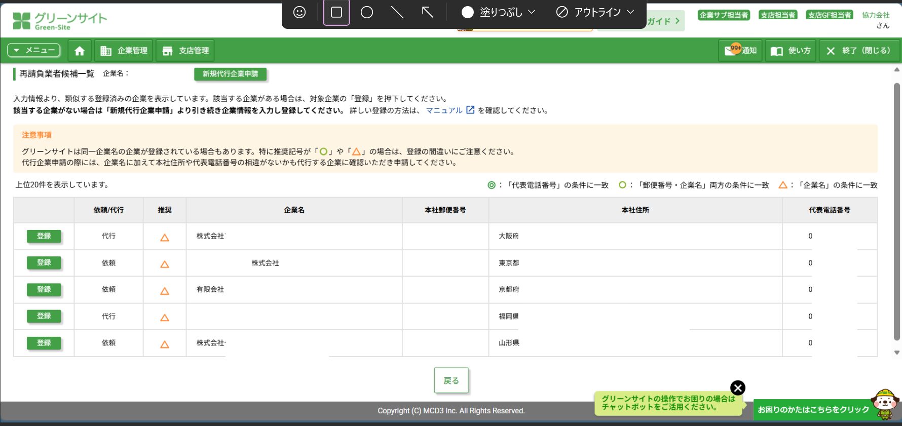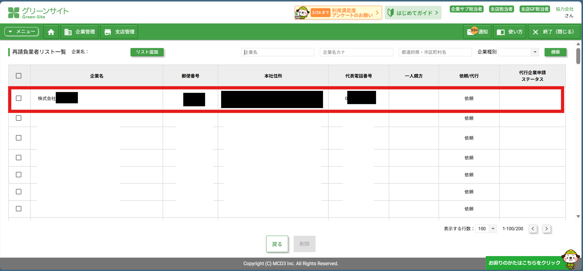 過去にグリーンサイトで提携している場合、「再請負業者リスト一覧」に相手社名が確認出来ます。