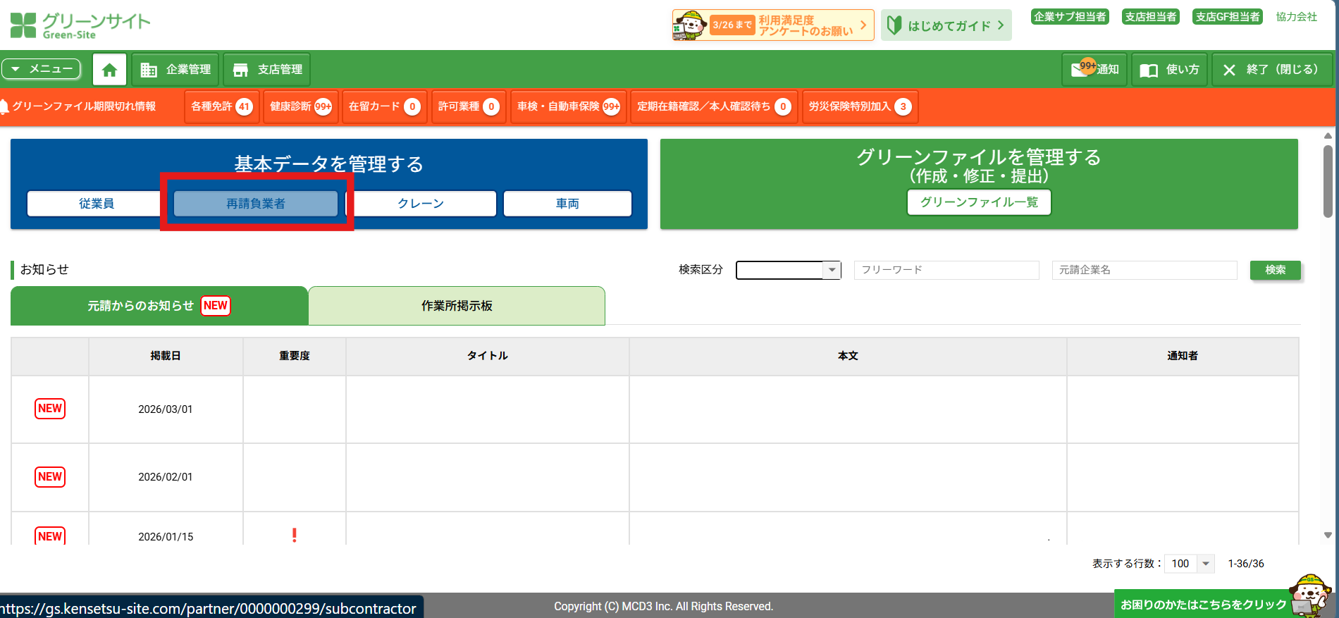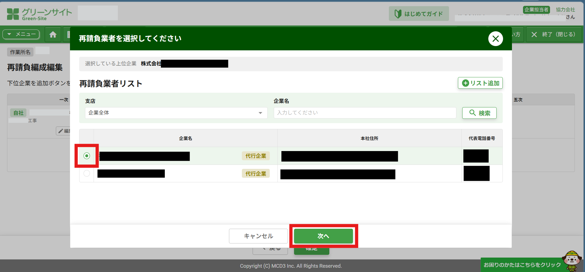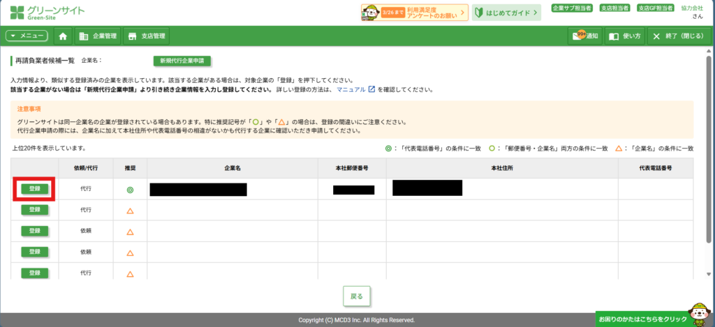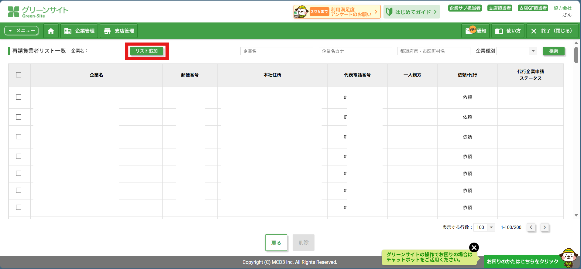 過去にグリーンサイトで提携している場合、「再請負業者リスト一覧」に相手社名が確認出来ます。