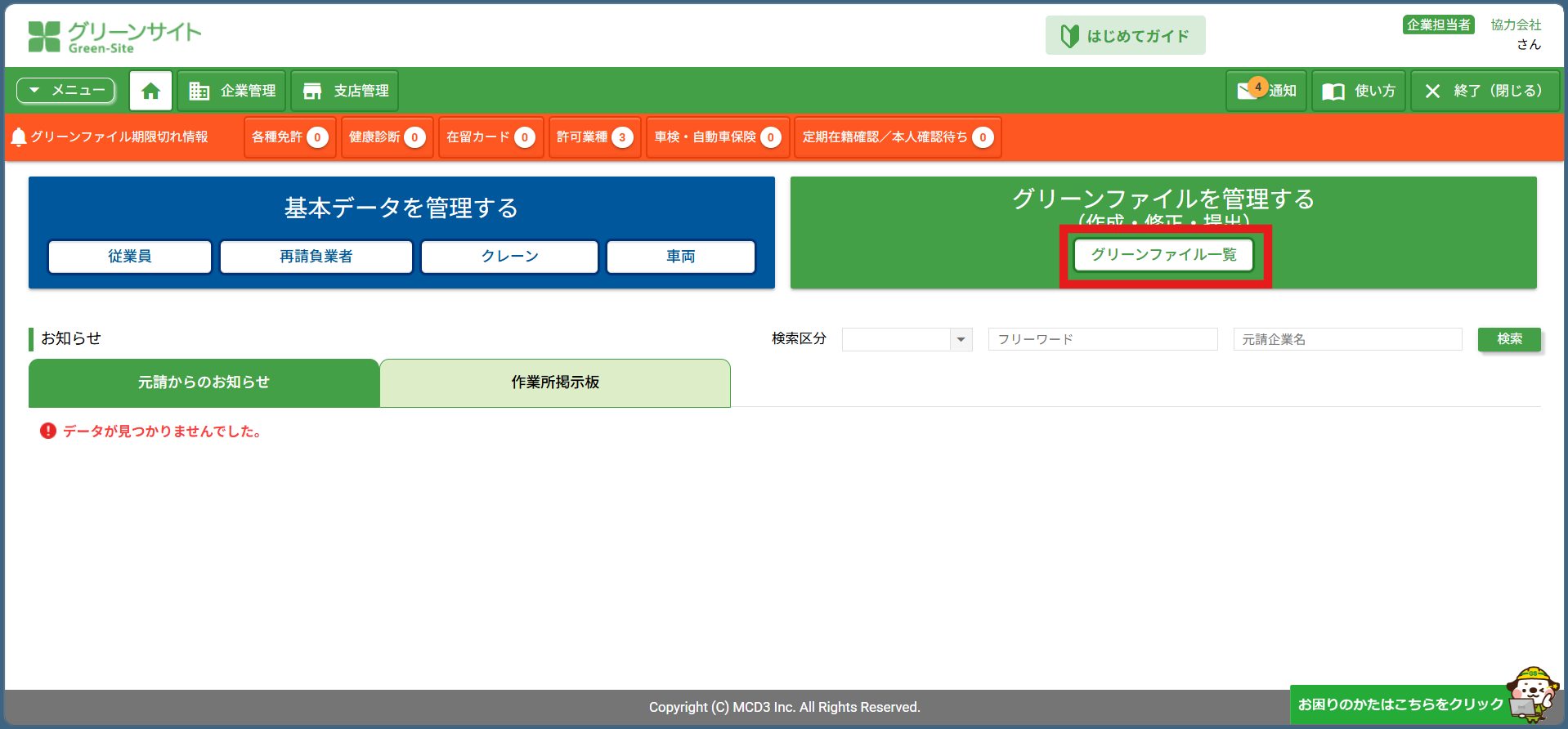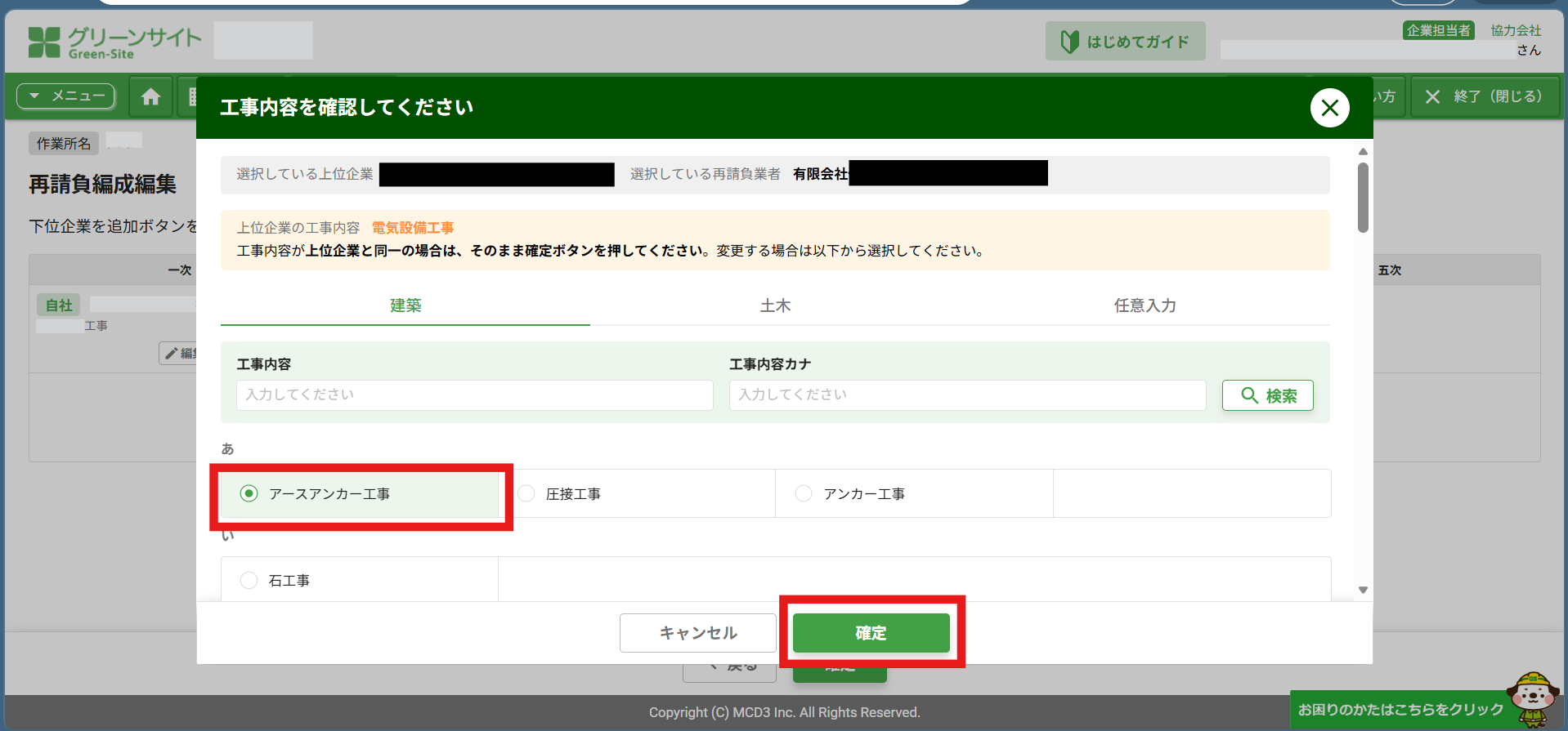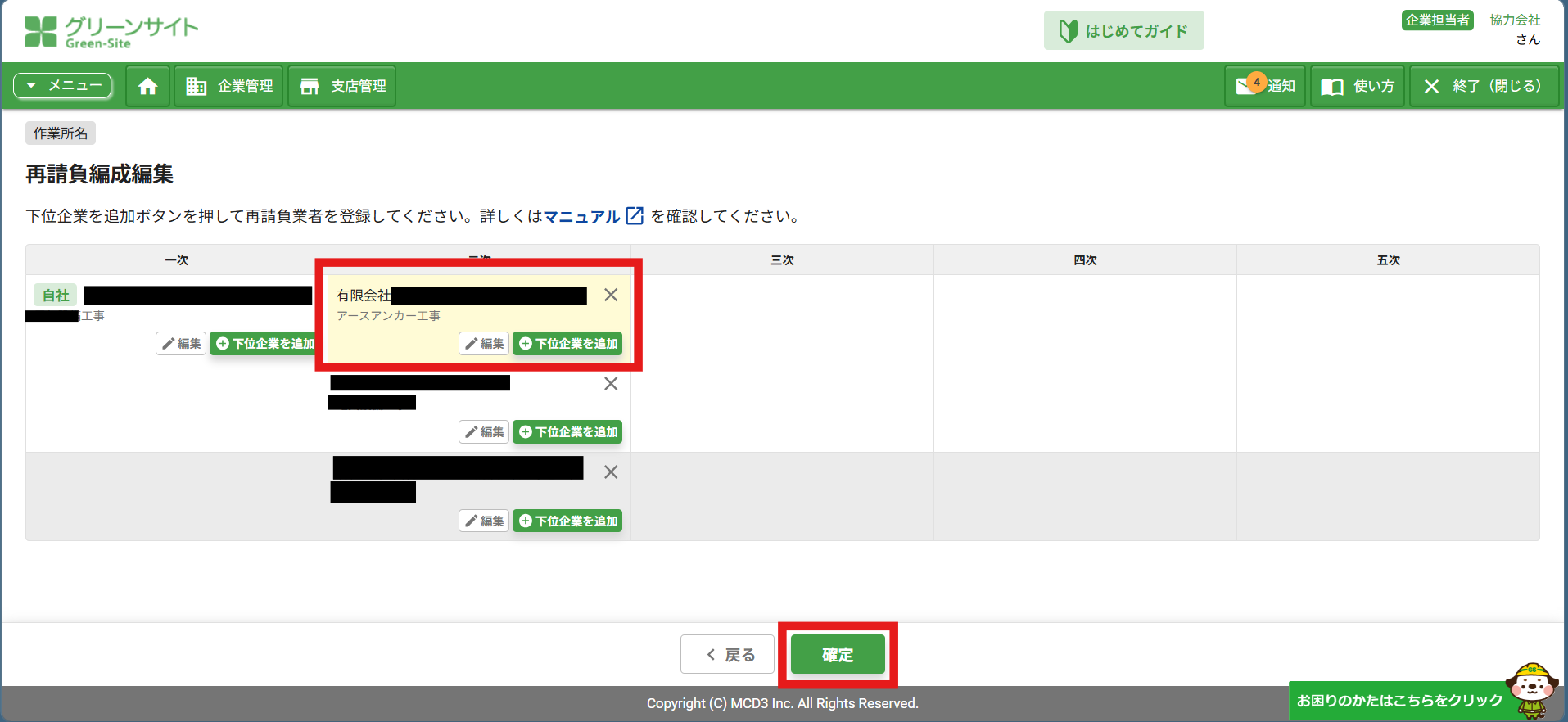施工体制に他の企業を招待する場合、相手企業のグリーンサイトの利用状況などで方法が変わります。