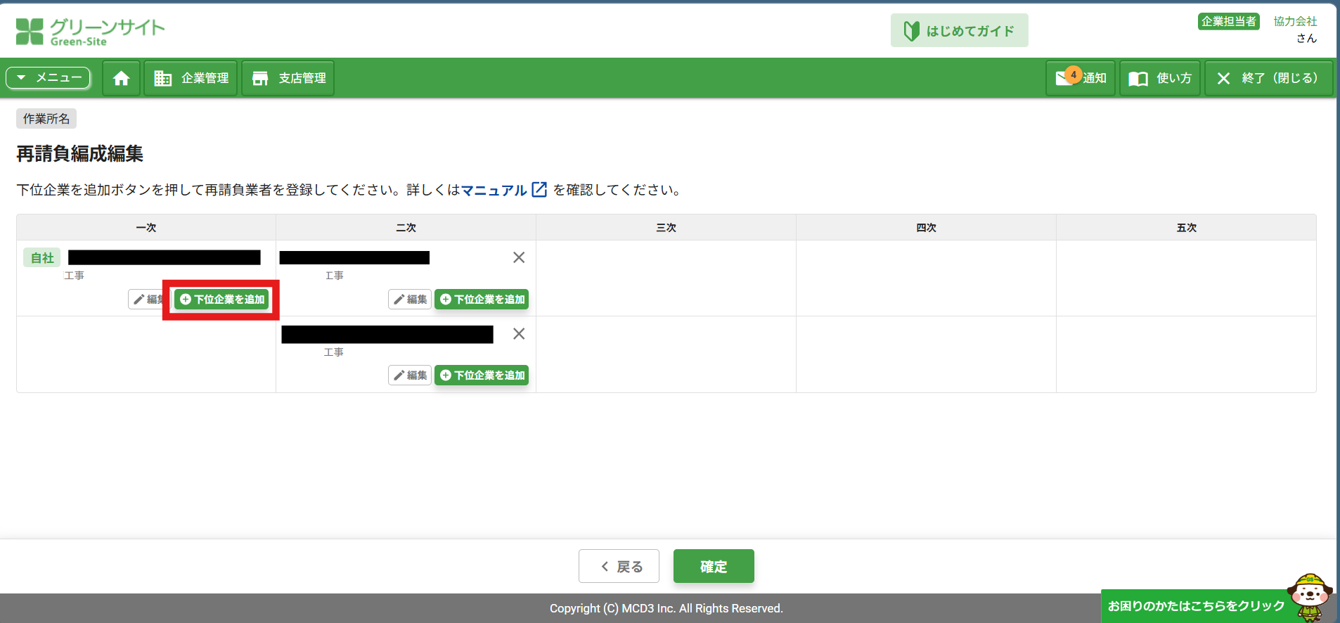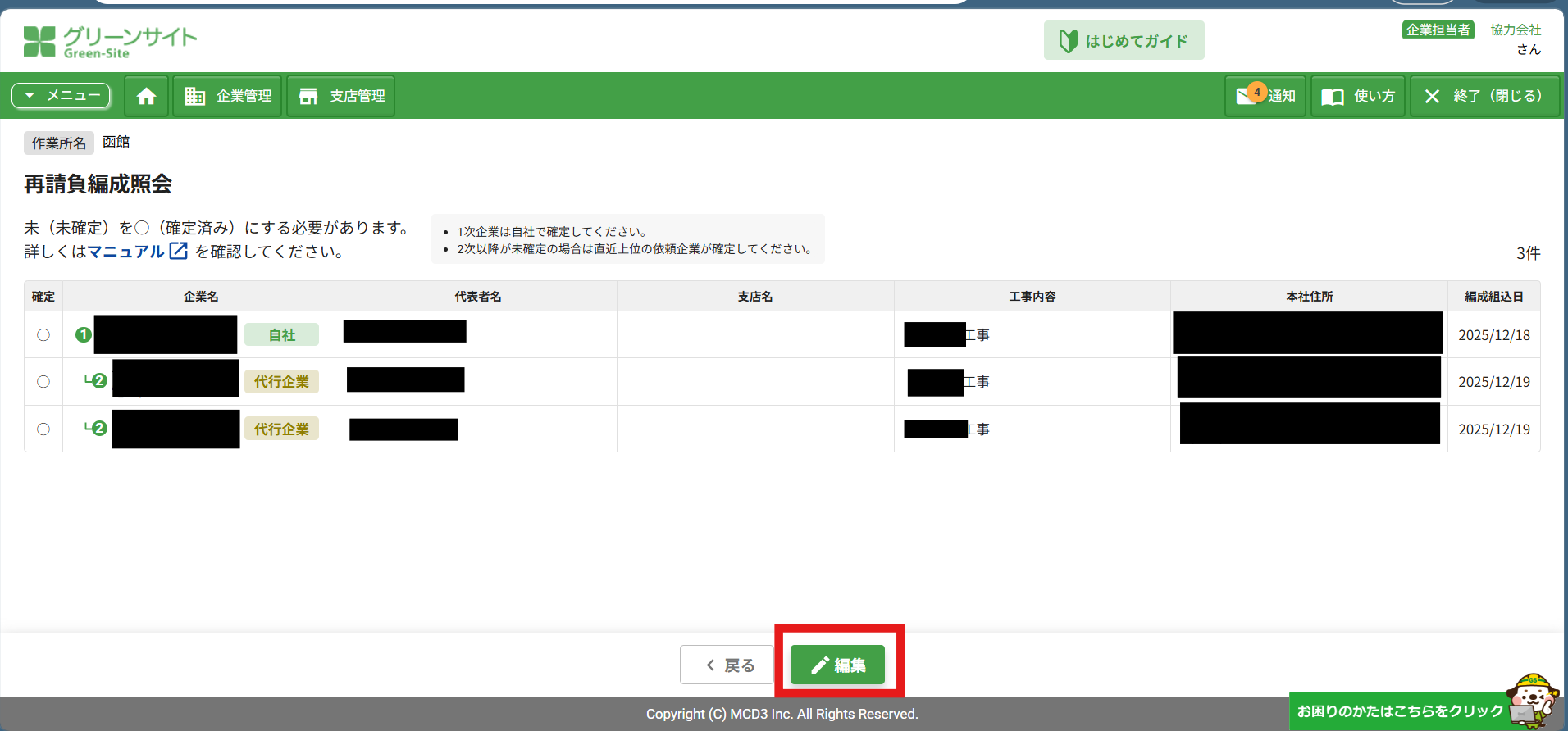 その場合5️⃣の手順で「再請負編成編集」から相手企業を招待できます。
