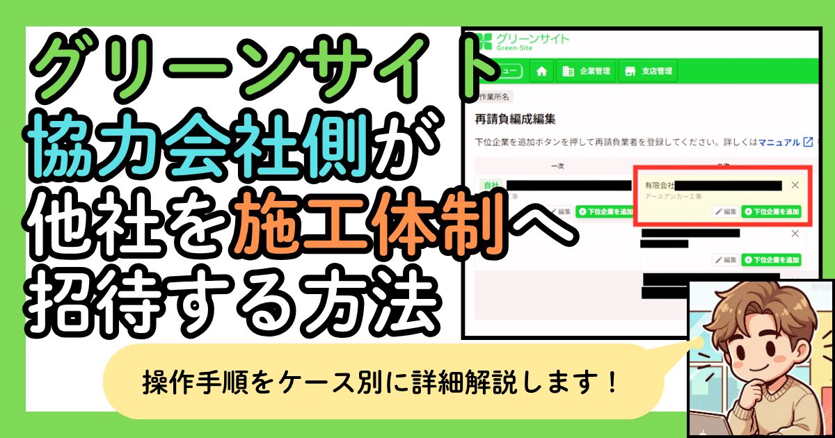 施工体制に他の企業を招待する場合、相手企業のグリーンサイトの利用状況などで方法が変わります。